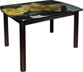 Столешница: МДФ, натуральный буковый шпон кромка, тонировка венге, стекло 4 мм с фотопечатью; Ножки: деревянные;